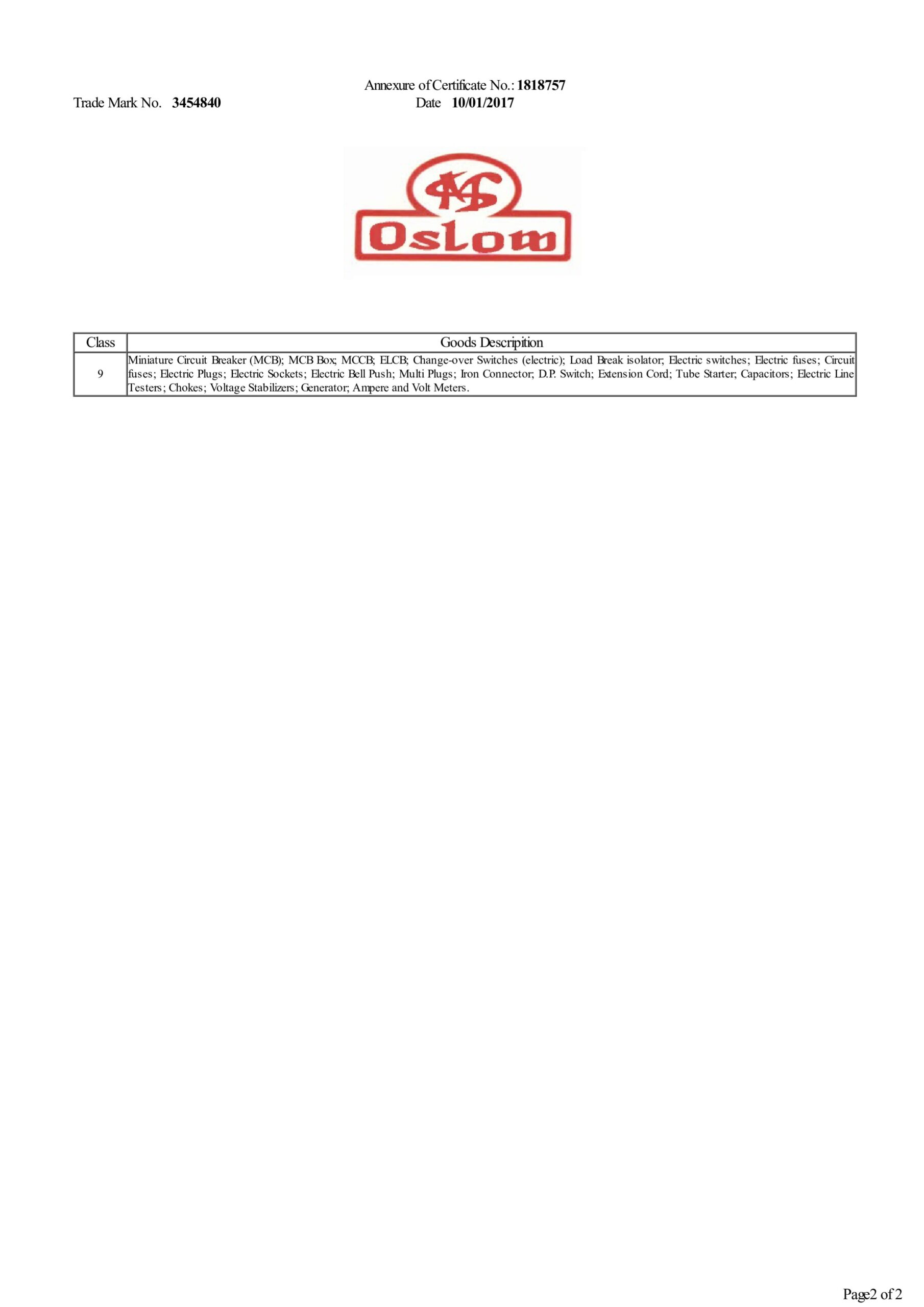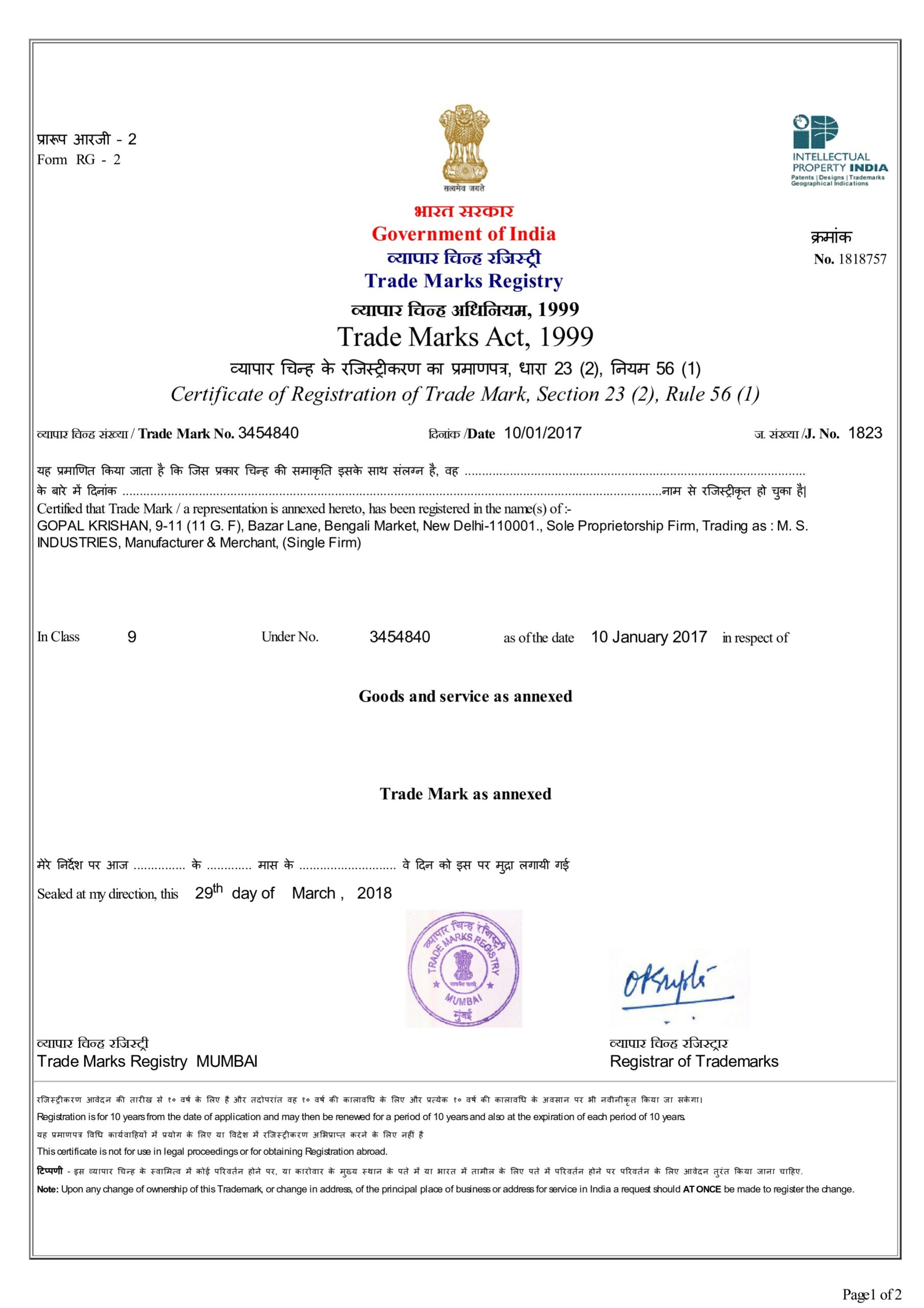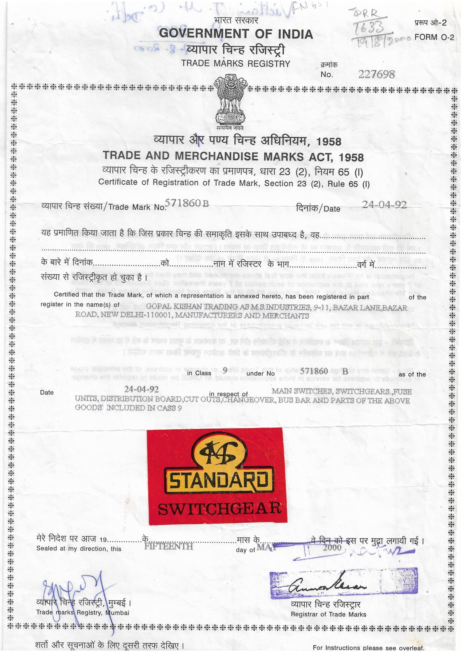 Trade Mark Certificate M S Standard Trade Mark M S Exclusive Trade Mark M S Oslow Trade Mark I M S Oslow Trade Mark II